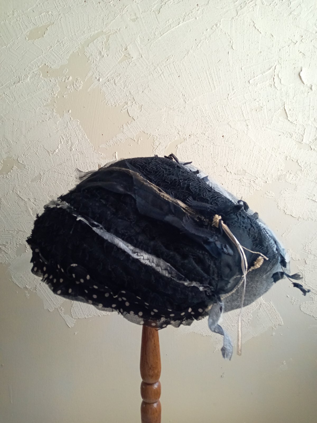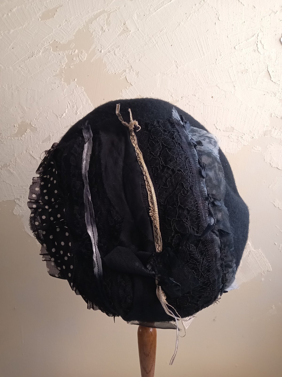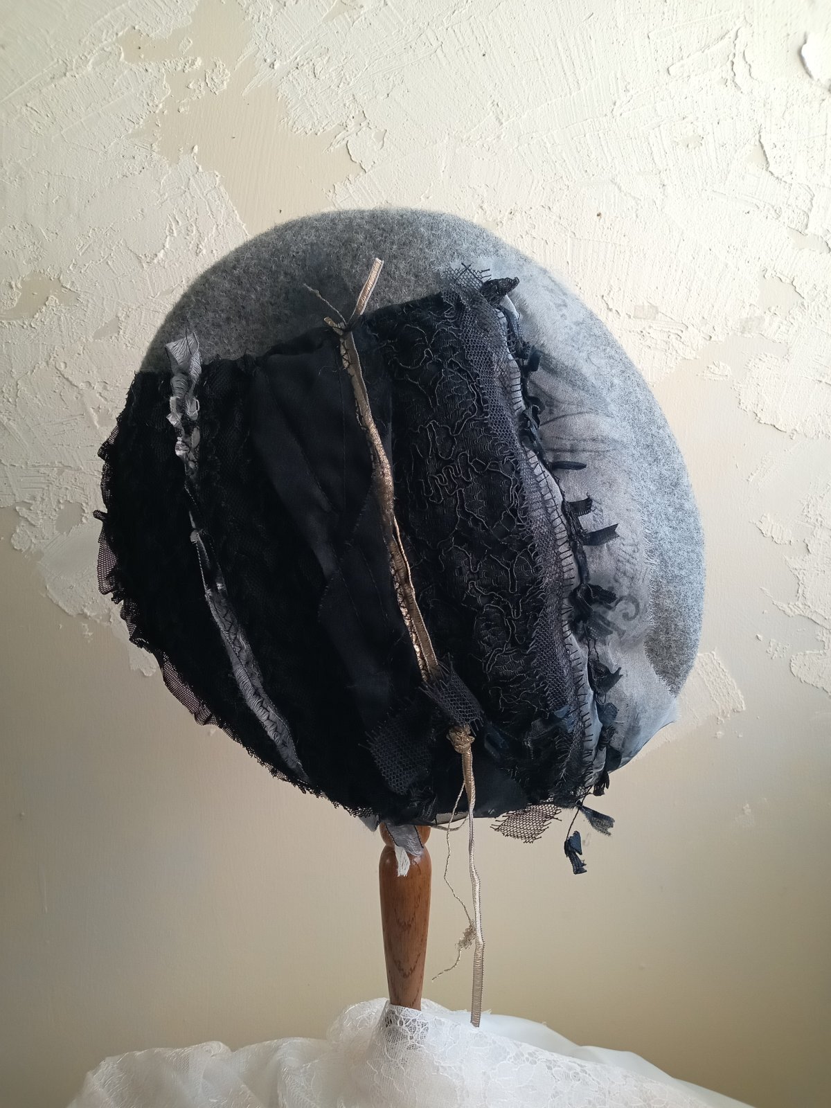 圧縮ウールのベレー帽に 糸 レース 裂き布をフリーモーションコラージュして テキスタイルアート感のある帽子に仕上げました。