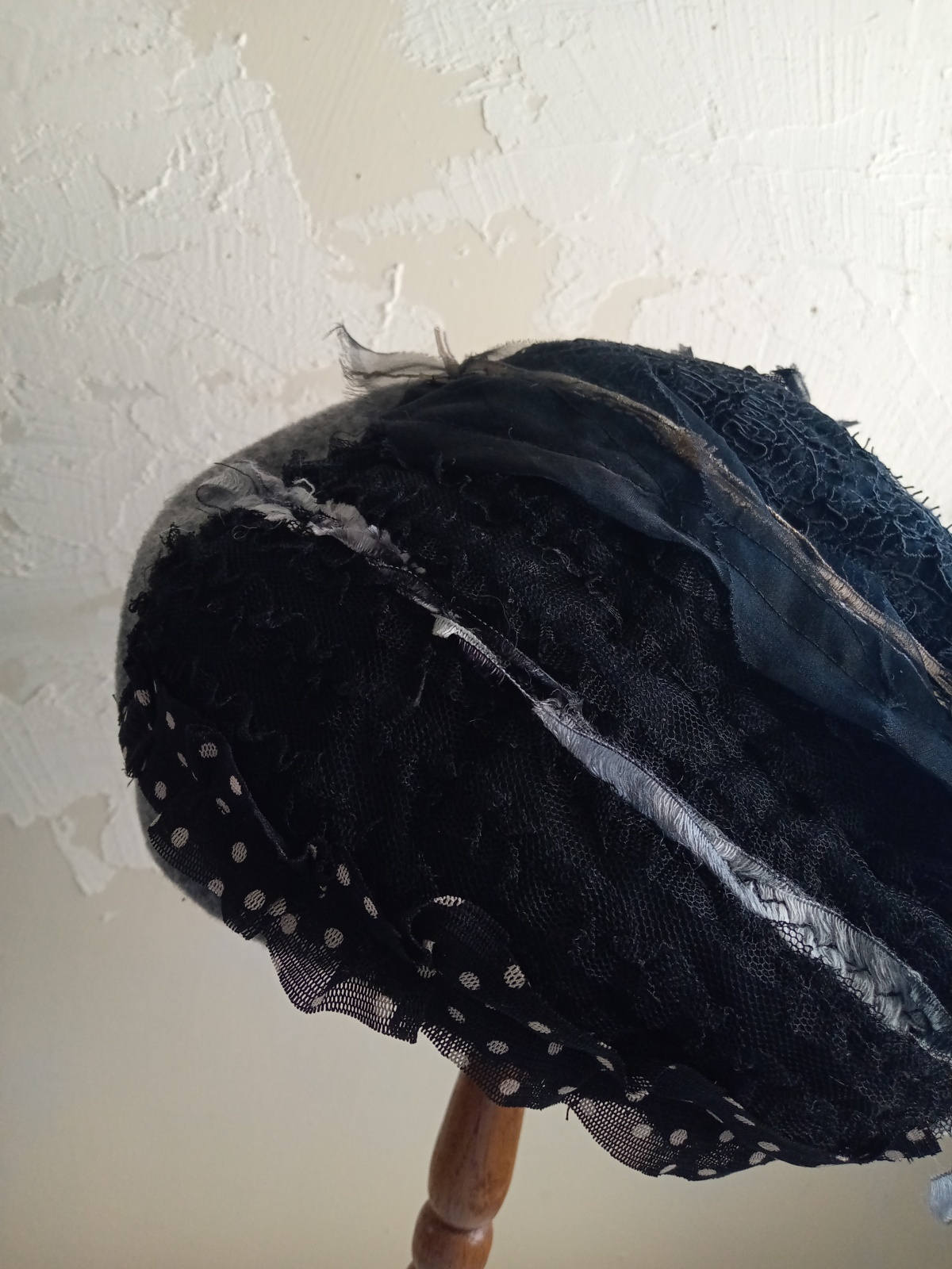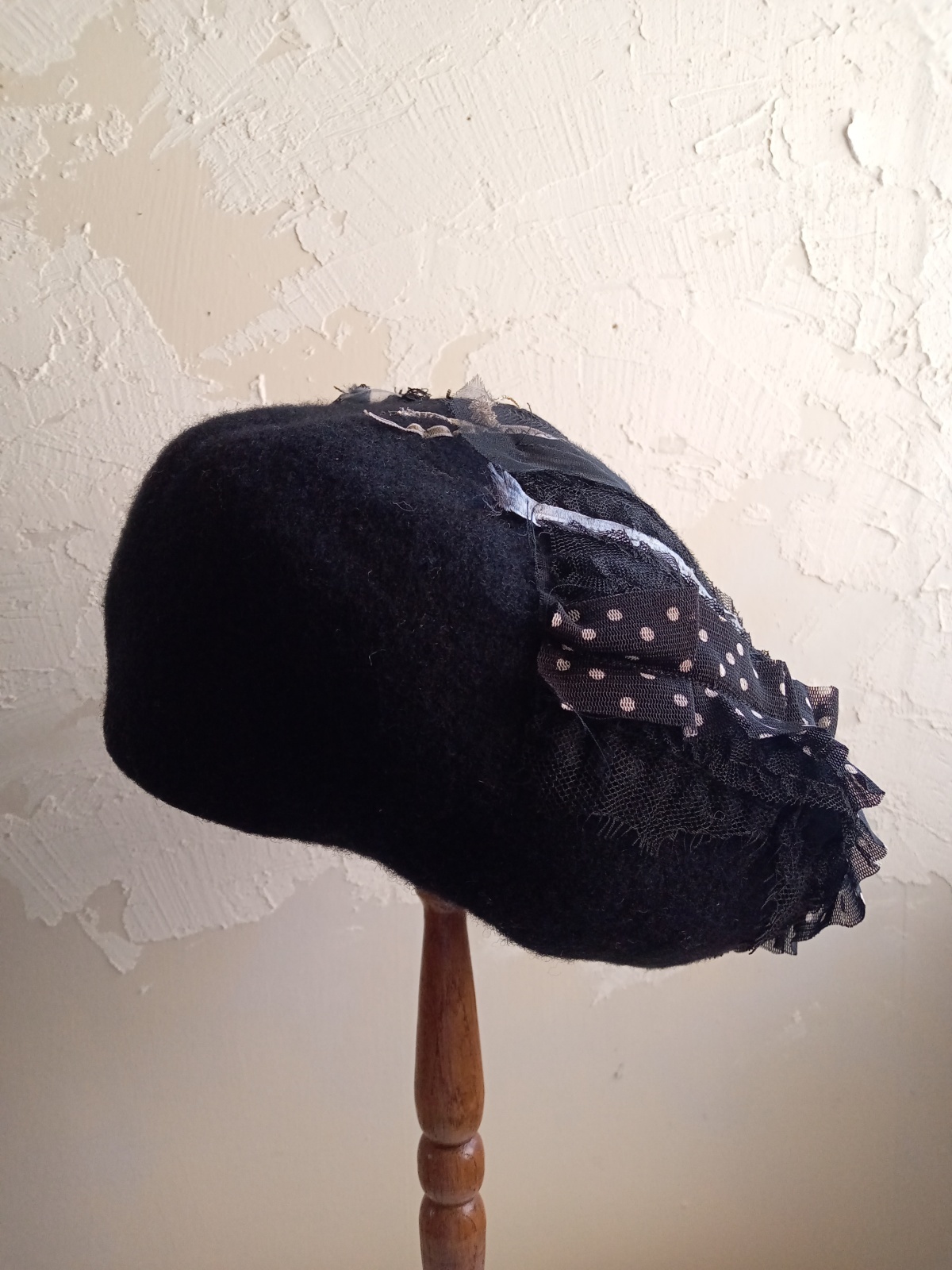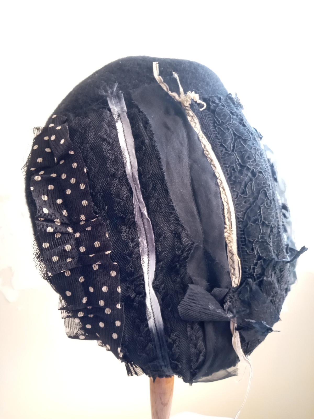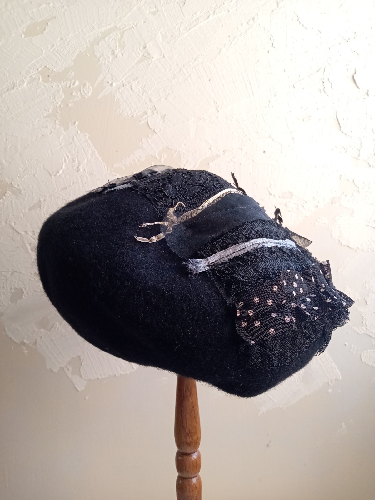 圧縮ウールのベレー帽に 糸 レース 裂き布をフリーモーションコラージュして テキスタイルアート感のある帽子に仕上げました。