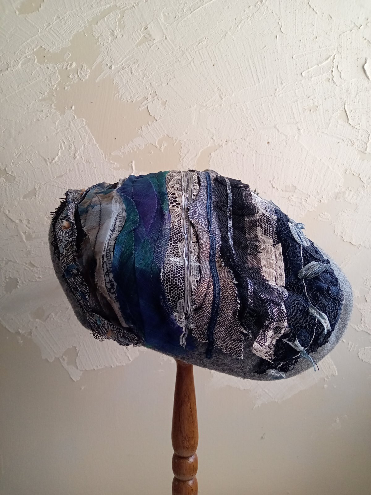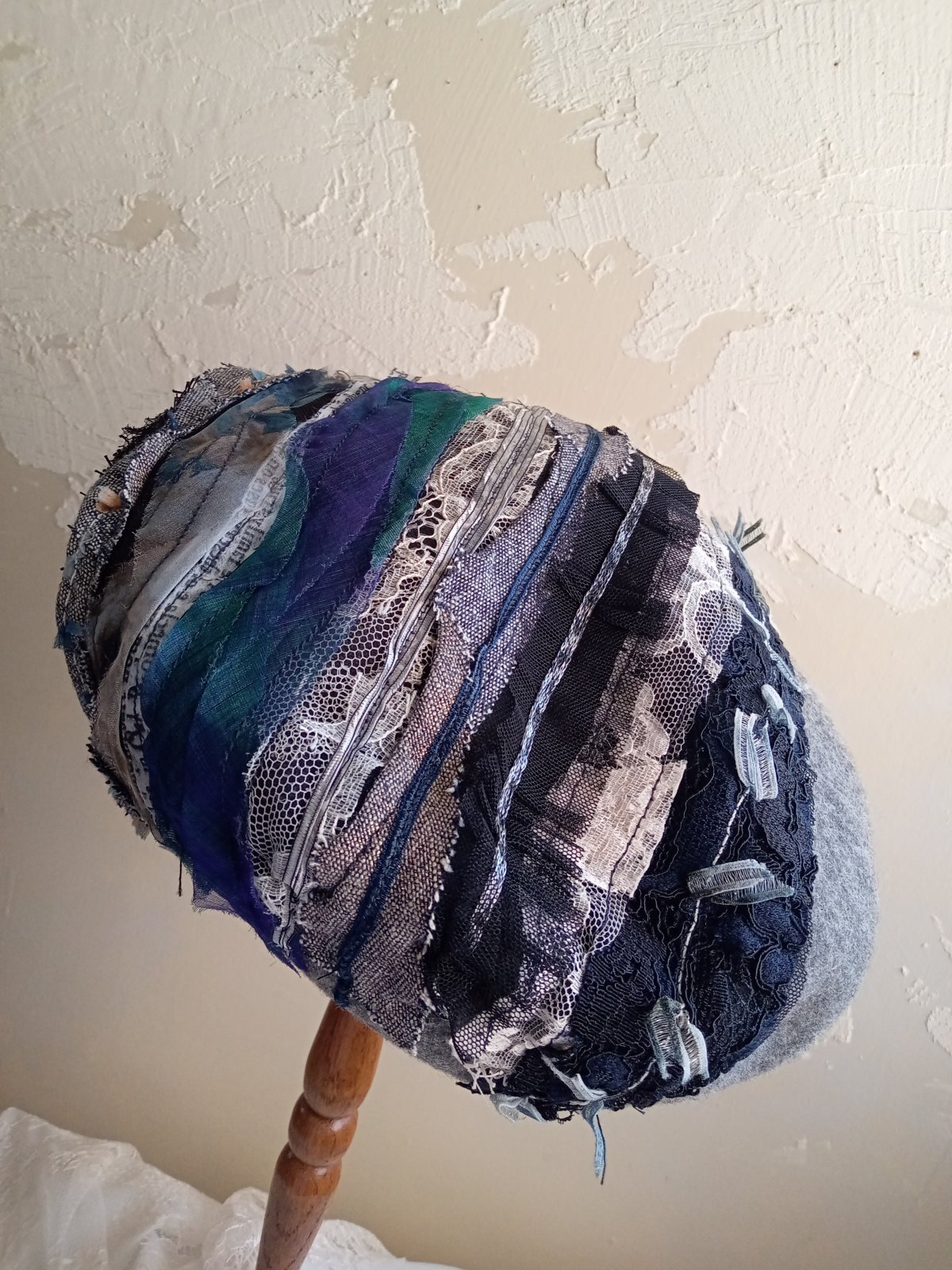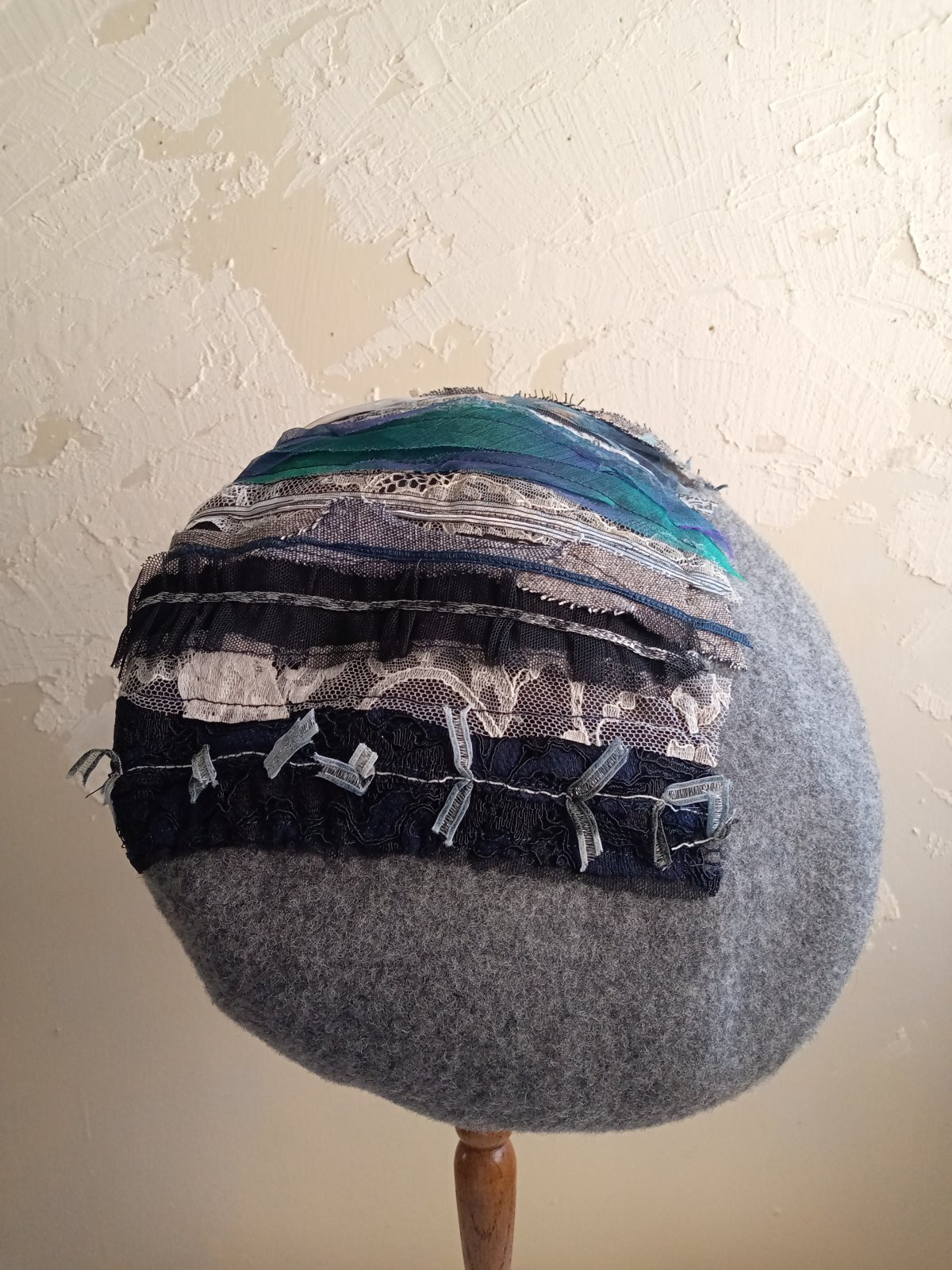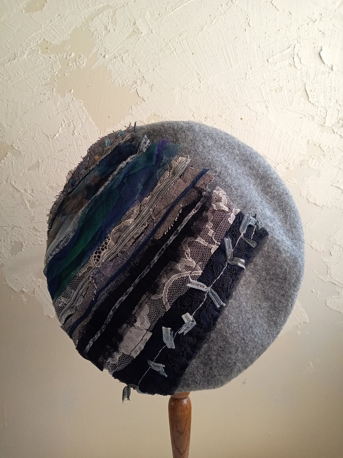 圧縮ウールのベレー帽に 糸 レース 裂き布をフリーモーションコラージュして テキスタイルアート感のある帽子に仕上げました。