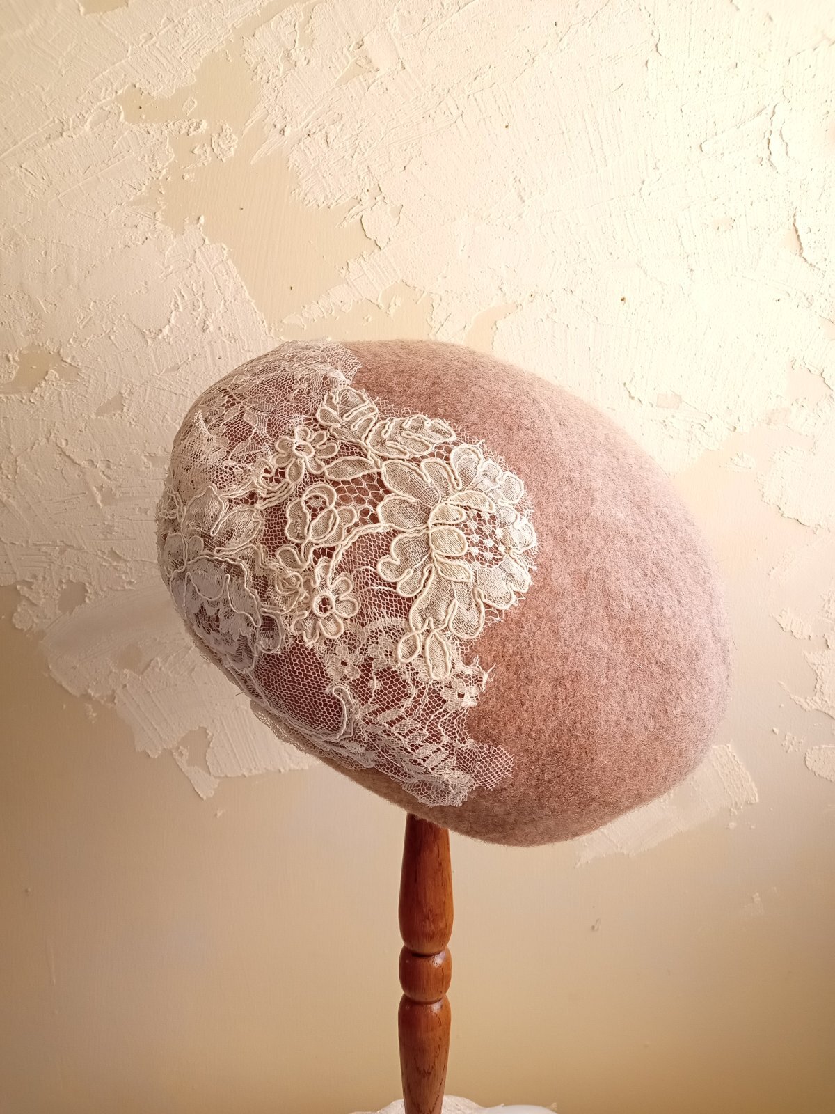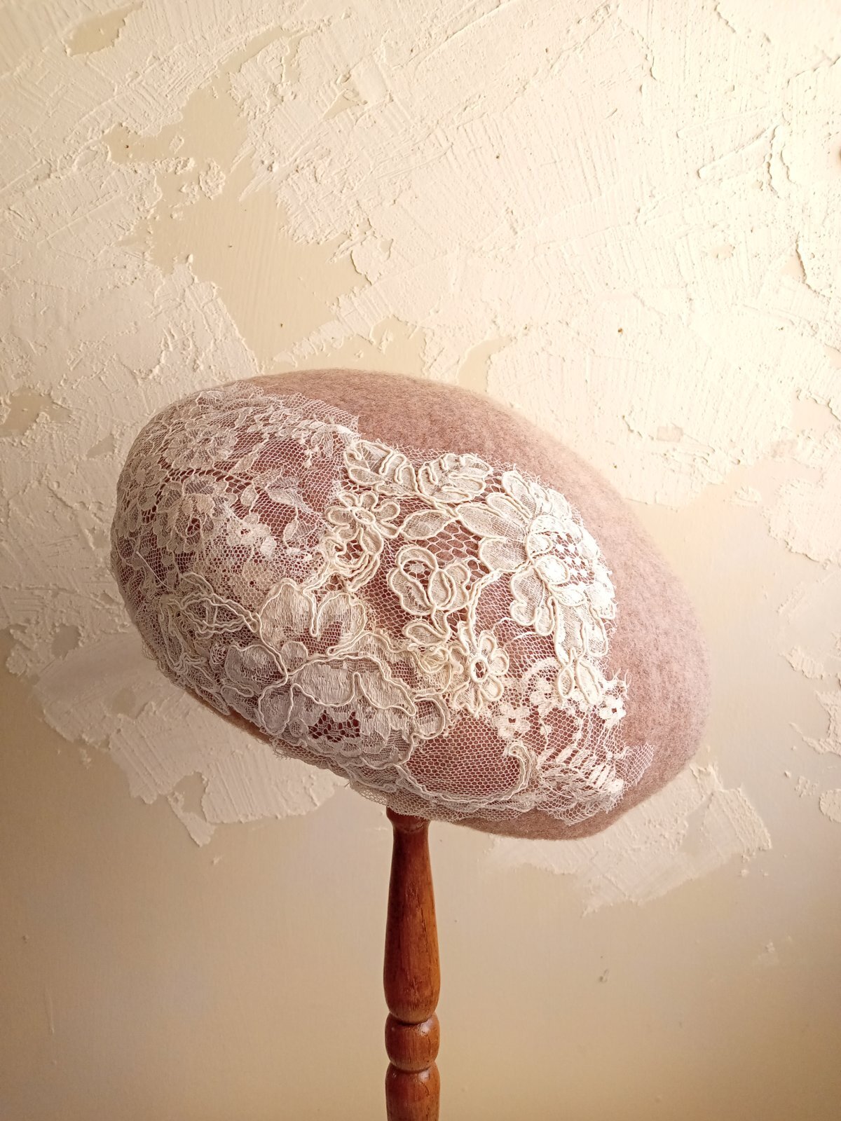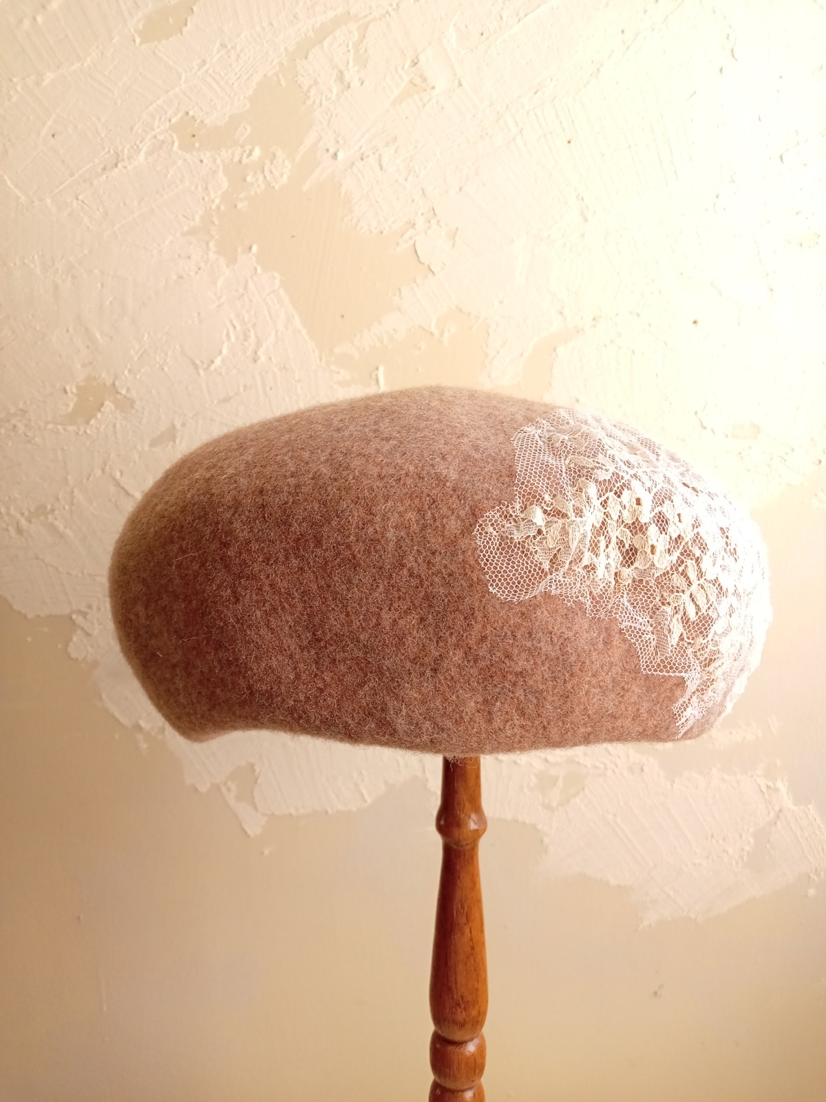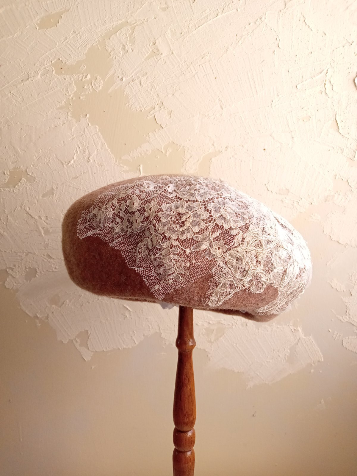 圧縮ウールのベレー帽に お気に入りのアンティークレースレース 現代レースを丁寧に手縫いでコラージュして 優しい秋色のベレー帽に仕上げました。