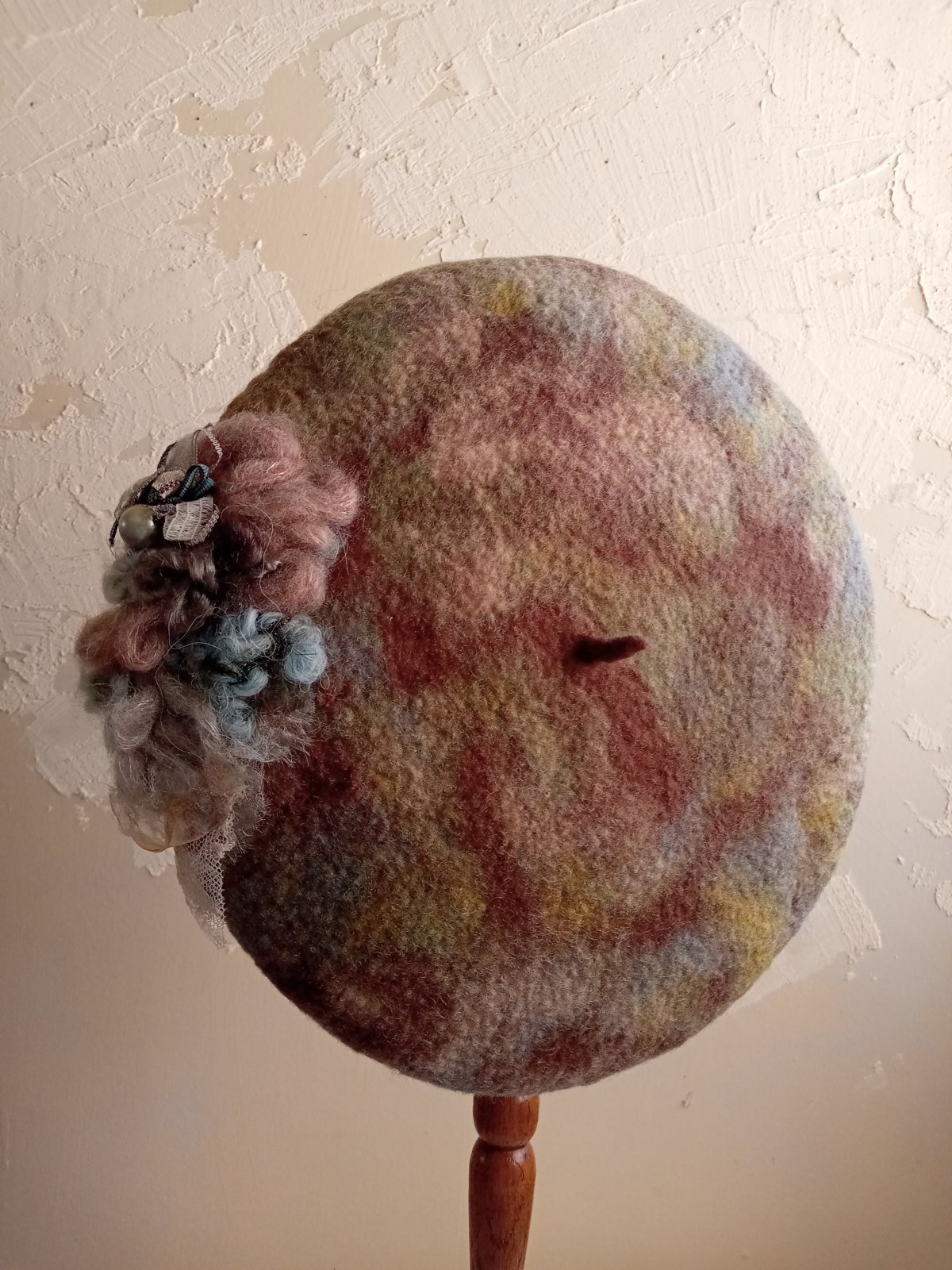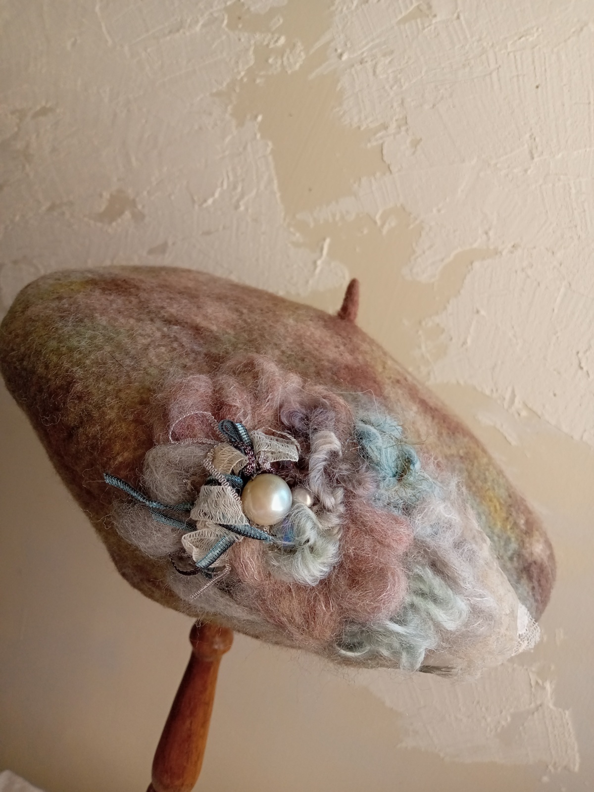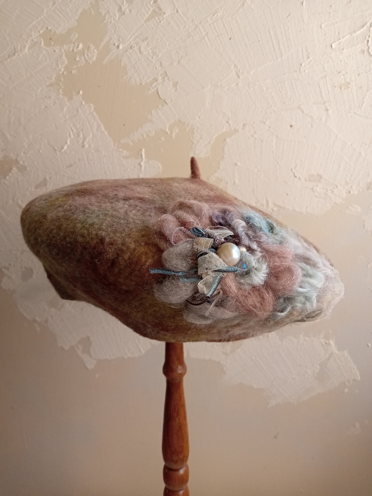 イギリスのメリノウールのベレー帽に 草木染めした糸とビーズとれーすを丁寧に手縫いでコラージュいたしました。