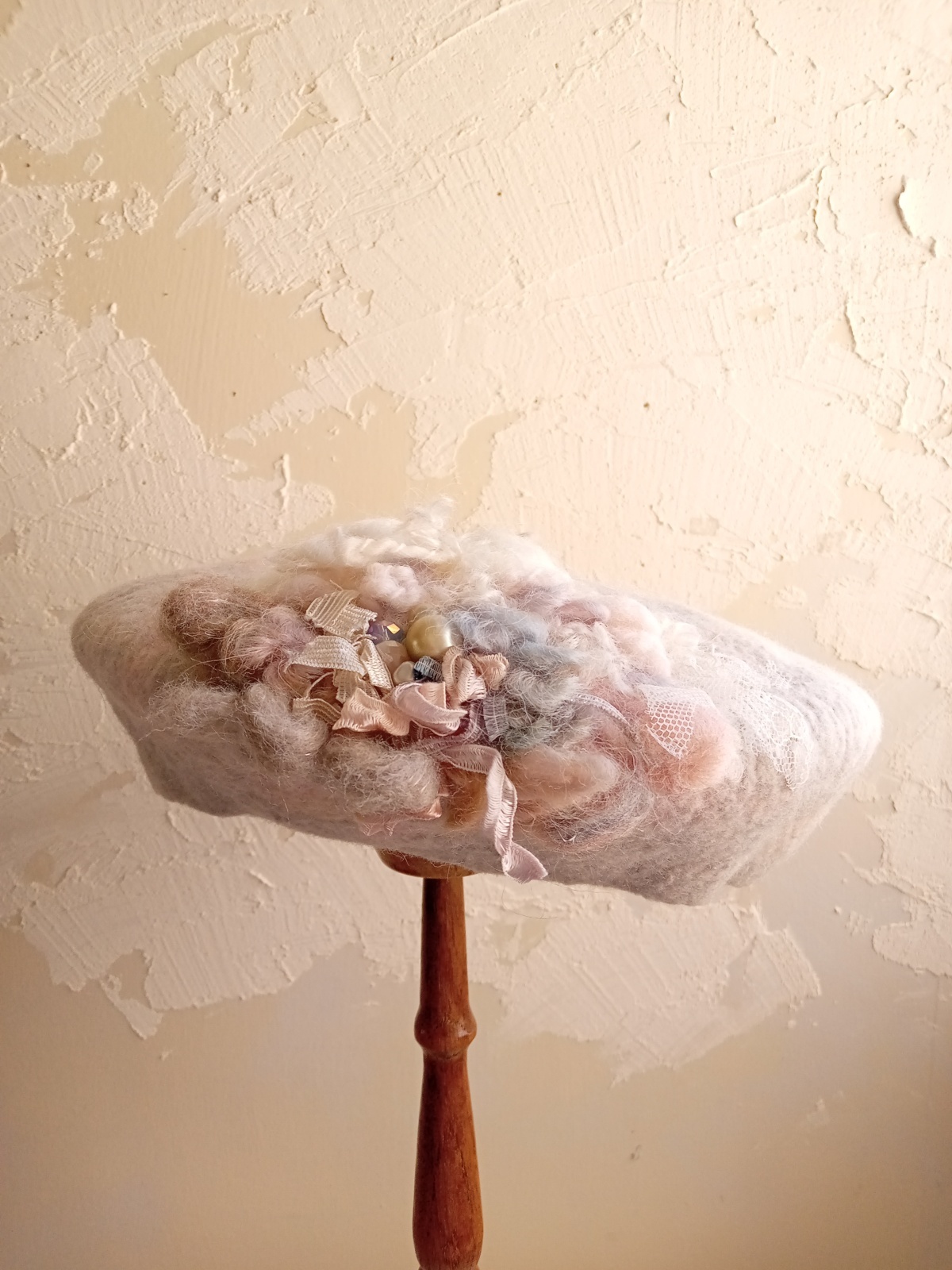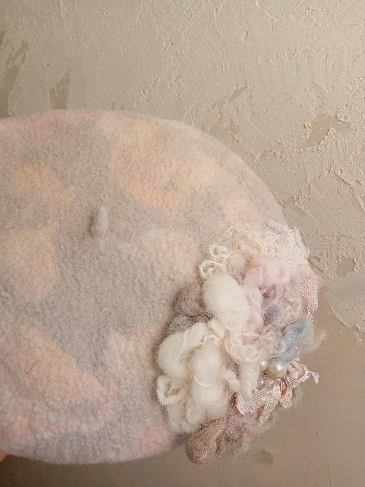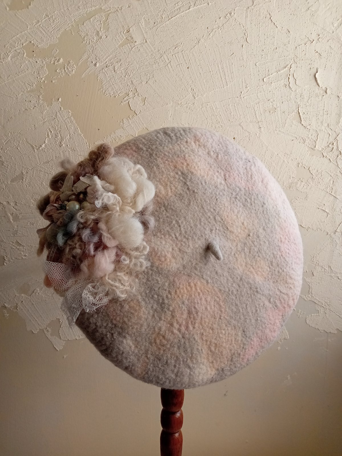 イギリスのメリノウールのベレー帽に 草木染めした糸とビーズとれーすを丁寧に手縫いでコラージュいたしました。