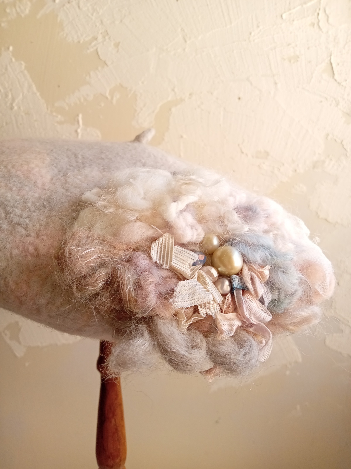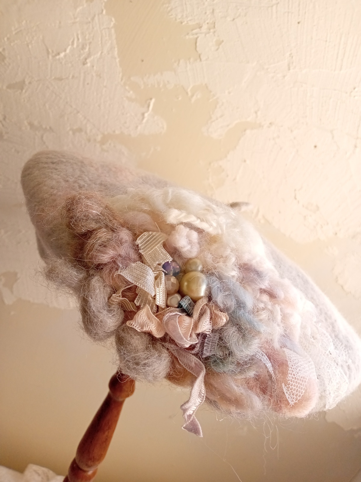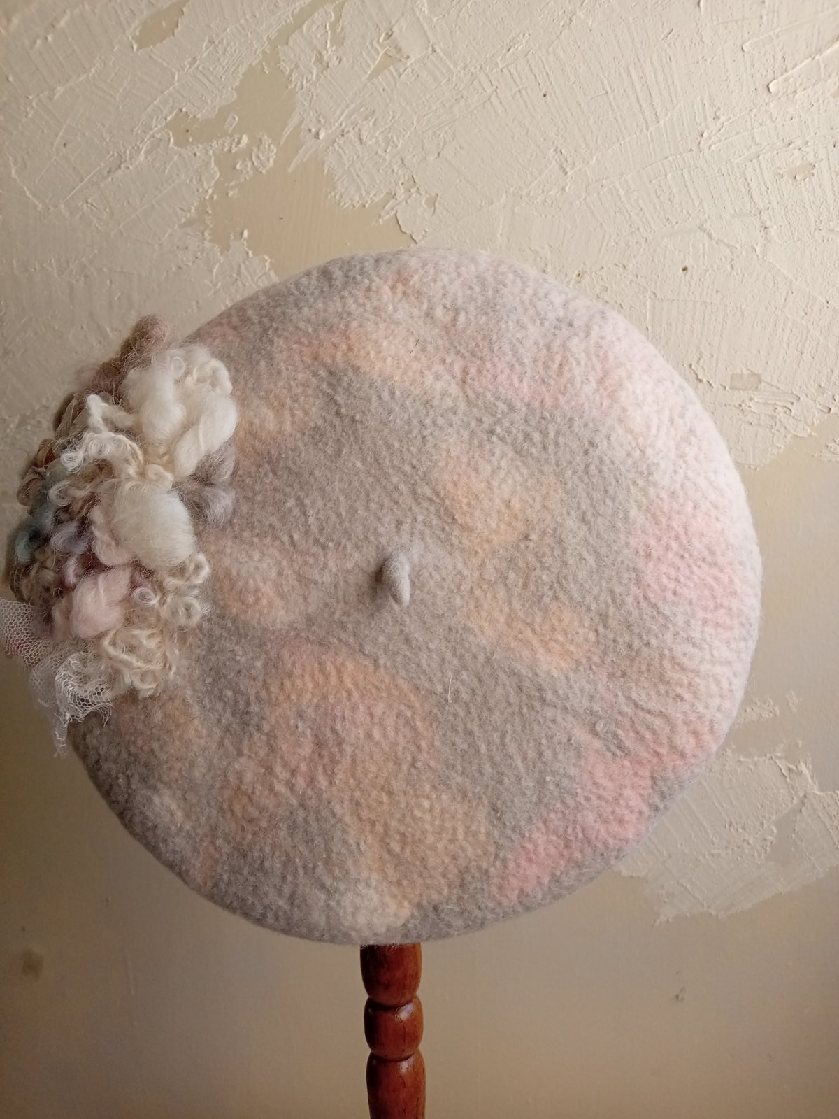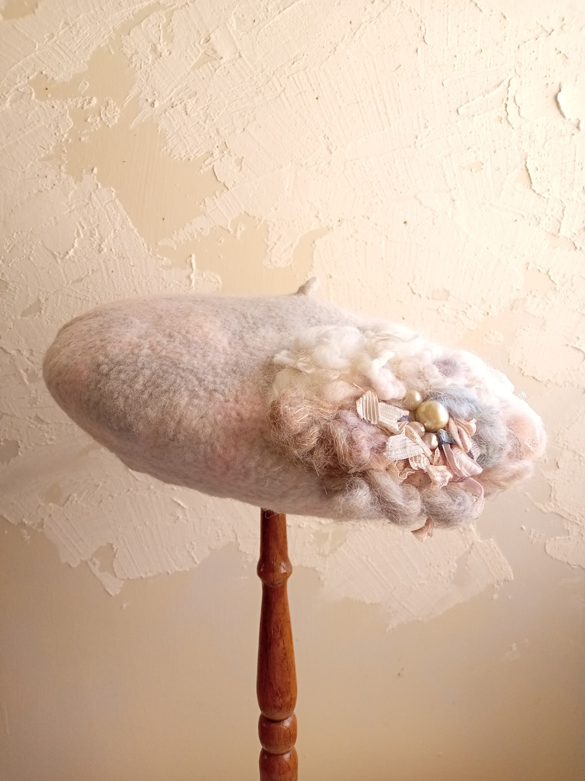 イギリスのメリノウールのベレー帽に 草木染めした糸とビーズとれーすを丁寧に手縫いでコラージュいたしました。